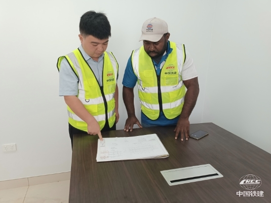 張發亮與當地工人探討圖紙(中鐵建設中原公司 供圖)