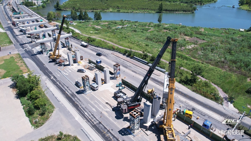 在全線重難點工程龍王江橋施工中,項目團隊打出了一套科技“組合拳”,通過跨地鐵疊合梁滿堂支架法施工、低凈空大噸位起重機提梁拼裝以及三幅并行曲線橋原位支架法拼裝等工藝的結合,猶如精密的外科手術一般——將11跨,總用鋼量約5000噸,最大跨度55米的鋼混疊合梁安裝誤差控制在2毫米內,施工期間還保障了河道、地面的正常通行安全。